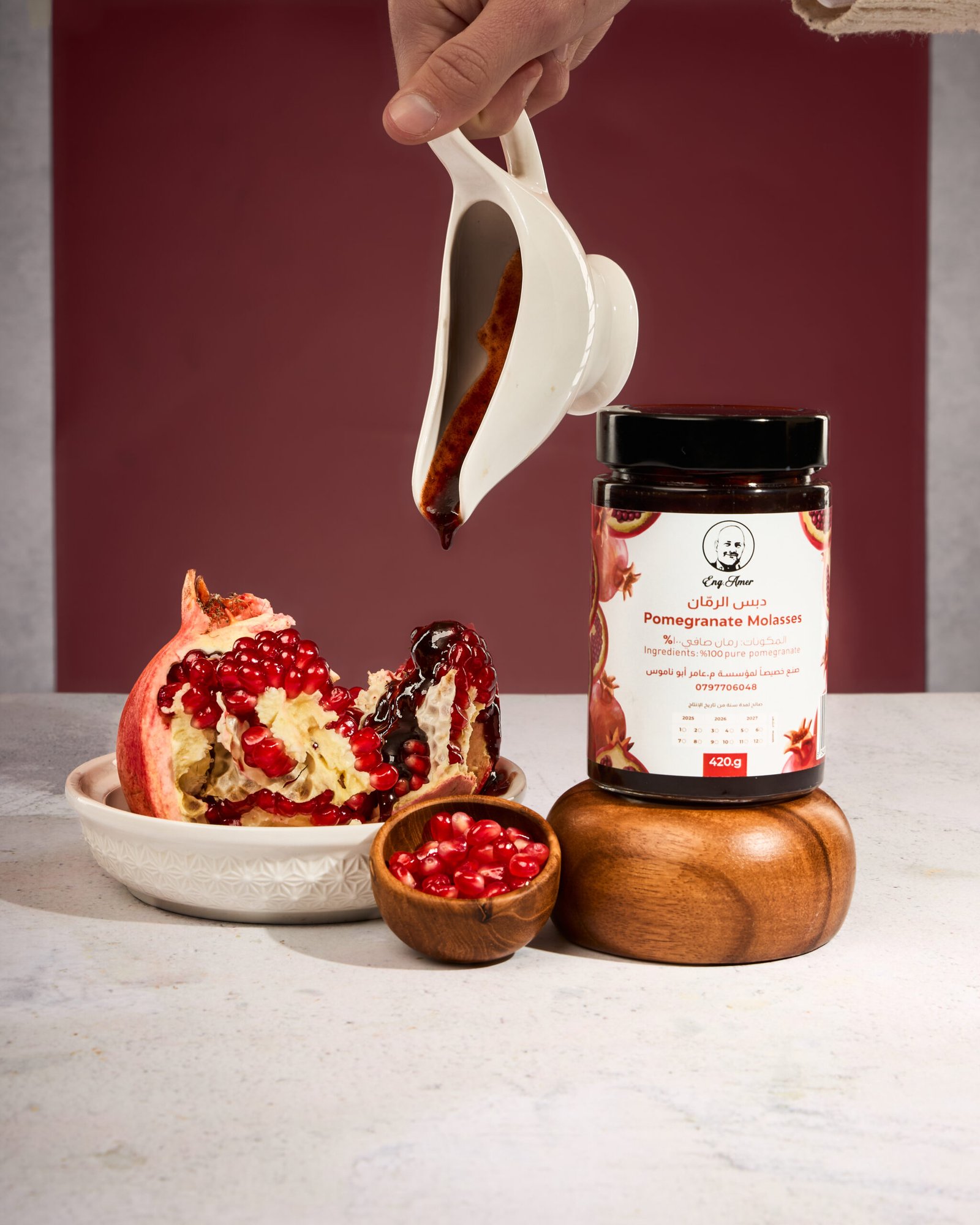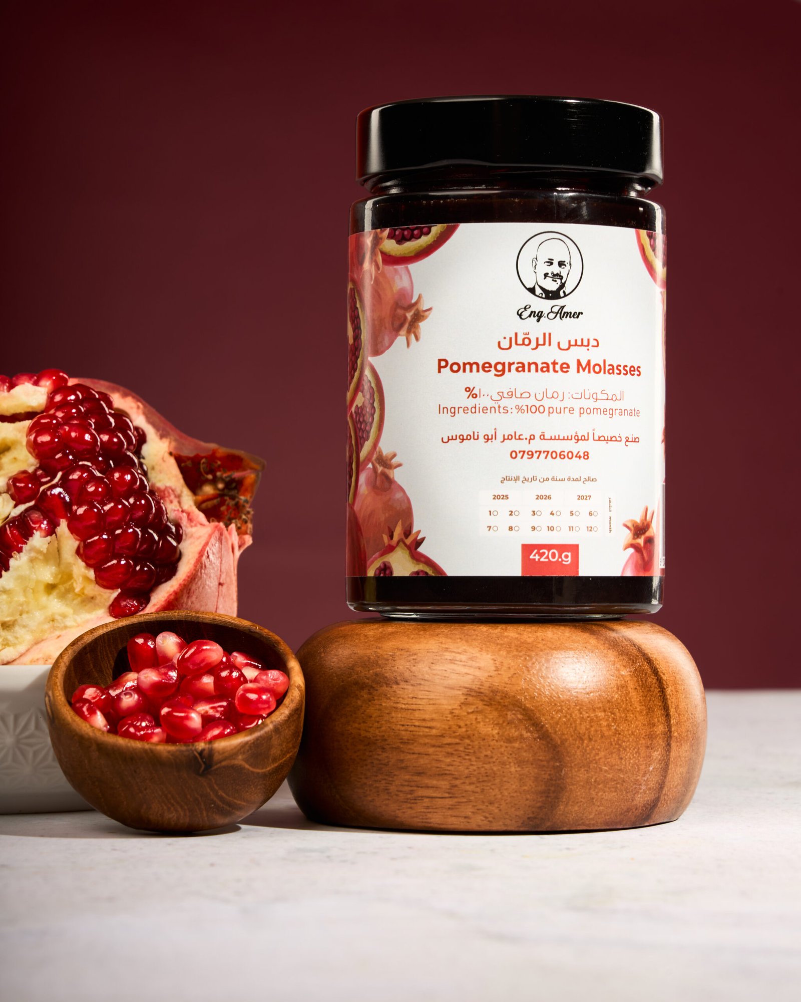 دبس رمان نقي 100% بدون سكر، بدون ملح ليمون، وبدون إضافات. حامض، طبيعي، ولذيذ. عبوة 420 غرام.